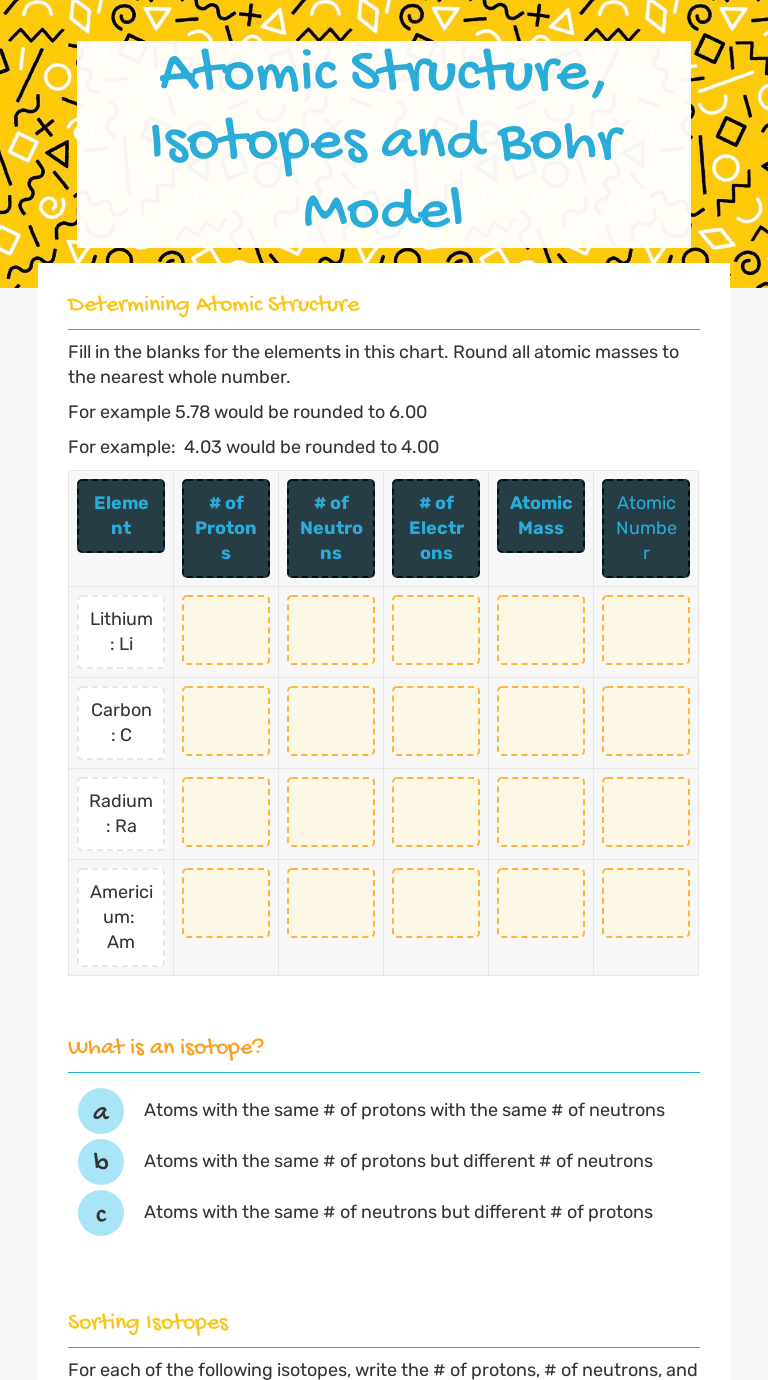 Symbol atomic number mass number number of protons … In order to calculate the number of neutrons you must subtract the from the. What you already know about the about the structure of the atom 1. Protons and neutrons are in … Give the symbol and number of protons in one atom of: Com lete the table below. Electron arrangement practice and key 17. In his atomic theory, dalton proposed that atoms … Fill in the table with the correct information. Counting atoms worksheet and key 14. 19.10.2021 · so, if you like to secure all of these outstanding images related to atoms and isotopes worksheet answers, press save button to store these images in your pc. Protons and neutrons are in … Theof an element is the average mass of an element 's naturally occurring atoms, or isotopes, taking into account theof each isotope.